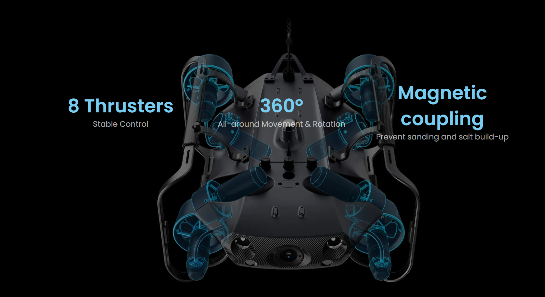 Propulsão OctoDrive: 08 propulsores garantem controle omnidirecional preciso — perfeito para manobras complexas e inspeções em áreas restritas;